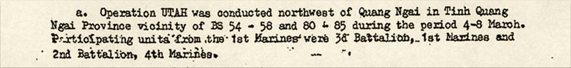Among the combatants were Kilo, Lima, and Mike companies of the 3rd Battalion, 1st Marine Regiment, First Marine Division. The Virtual Vietnam Archive contains this brief reference 3/1’s part in Operation Utah; it’s interesting to note how such military/bureaucratic scribblings hide so much blood and suffering: