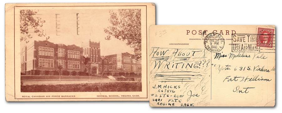 On July 28, 1940, a young Canadian airman named Joe Hicks mailed a picture postcard from a Royal Canadian Air Force school in Regina, Saskatchewan, to a young woman in Fort William, Ontario. Fifty-nine years later, I bought that postcard at an antique store in Quesnel, British Columbia.