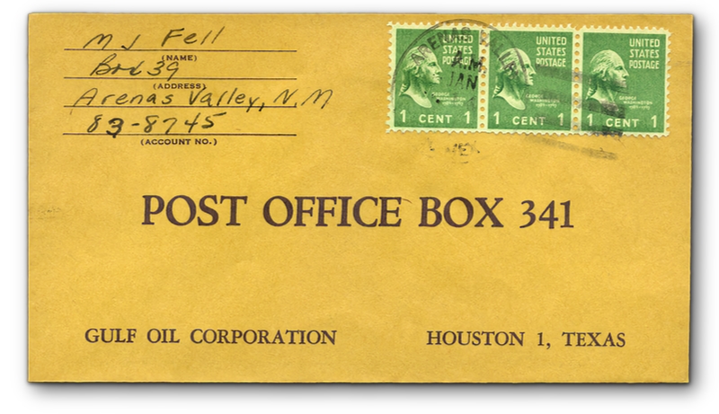 The Fells moved to Silver City in 1957, and Marvin operated the gas station until 1967. Marvin probably posted the cover to the Gulf corporation some time later perhaps years later, when he visited a friend or friend in Arenas Valley. In 1967, Marvin either closed the gas station or sold it, and started working for the newly reopened Phelps Dodge Corporation copper mine at Tyrone, five miles south of Silver City.