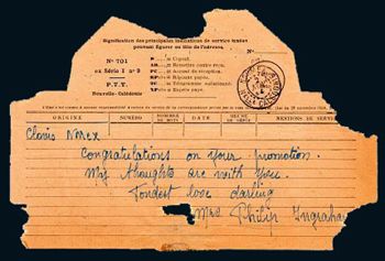 The telegram has a receiving mark, a circle date stamp (CDS) from the New Caledonia post office, dated November 2, 1944. Civilian telegraph lines were often administered by postal administrations, which use the same type of CDS to cancel stamps on letters.